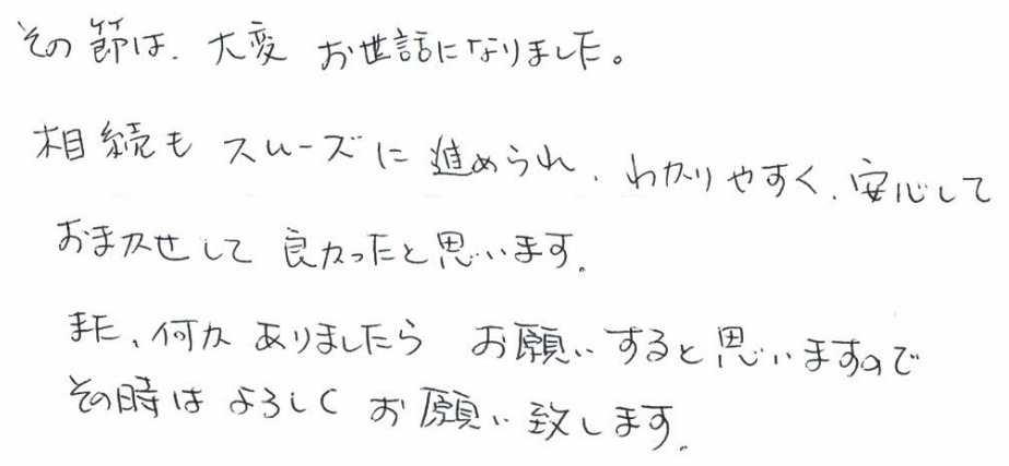 相続手続きをサポートさせて頂いたI様より「お客さまの声」を頂きました