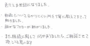 相続手続きをサポートさせて頂いたT様より「お客さまの声」を頂きました この度はありがとうございました。 お客様に寄り添いながらスムーズな対応ができるよう、今後も心掛けて参ります。 また何かお困りごとがございましたら、お気軽にご相談ください。